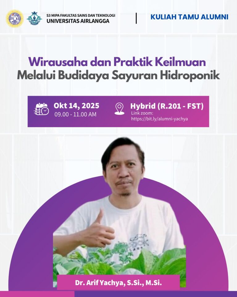 Wirausaha & Praktik Keilmuan: Budidaya Sayuran Hidroponik 14 Okt 2025 | 09.00–11.00 WIBR.201 FST | Zoom: https://bit.ly/alumni-yachyaMeeting ID: 954 9943 2523Passcode: S3MIPADr. Arif Yachya, S.Si., M.Si. Belajar praktik hidroponik berbasis sains + peluang usahanya. Pendaftaran : https://bit.ly/hidroponik_S3mipa25 Ditunggu kehadirannya!