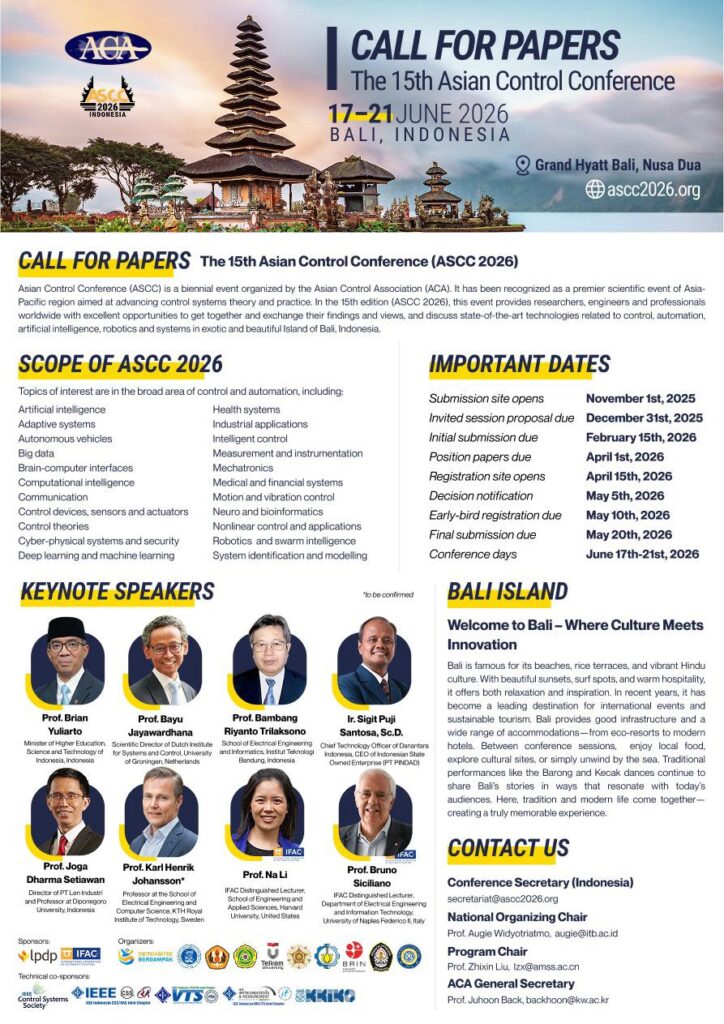 We invite you to the 15th Asian Control Conference (ASCC) 2026, which will be held on June 17-21, 2026 in Grand Hyatt Bali, Nusa Dua, Indonesia.